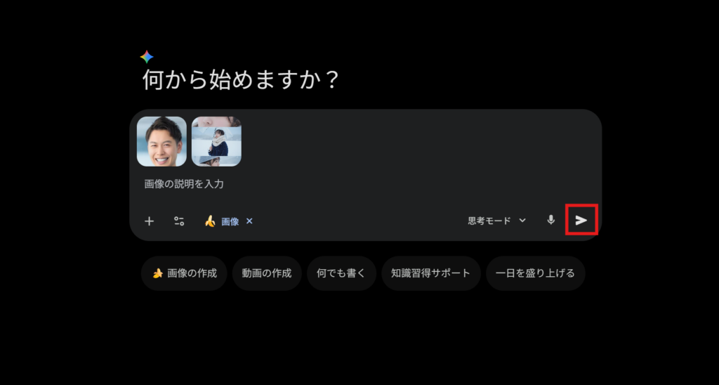 写真が添付された状態で、プロンプト入力欄の送信ボタンをタップします。プロンプトは空欄で大丈夫です。