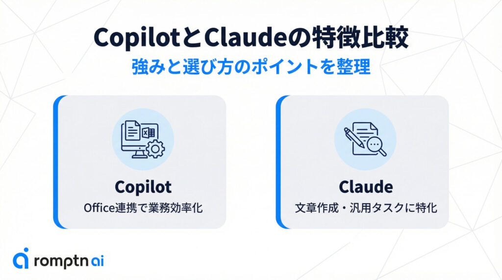 - CopilotはM365/Windows連携に強く、Claudeは文章作成・要約・調査・コネクタ連携に強みがある