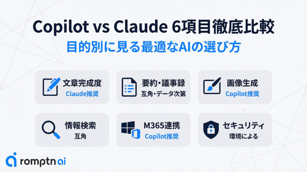以下では、文章の仕上がりや要約、画像生成、情報検索、Microsoft 365連携、法人セキュリティなどの6項目で比較します。
