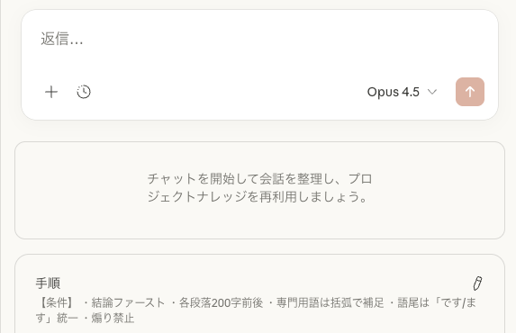 特に、ClaudeではProjectsに「トーン&マナー」「用語集」「構成テンプレ」を入力しておくことで、繰り返し同じテーマで文章を作成する際にその品質を均一に保ちやすくなります。