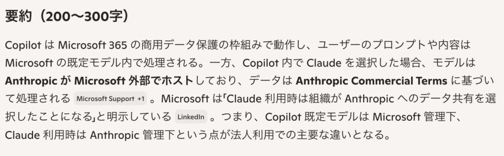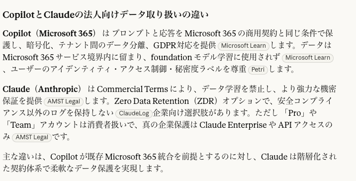 「CopilotとClaudeの“法人向けデータ取り扱い”の違いを、公式情報に基づいて200〜300字で要約。出典を3つ以上」