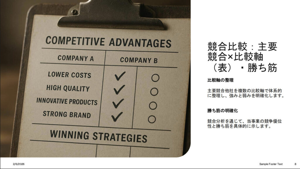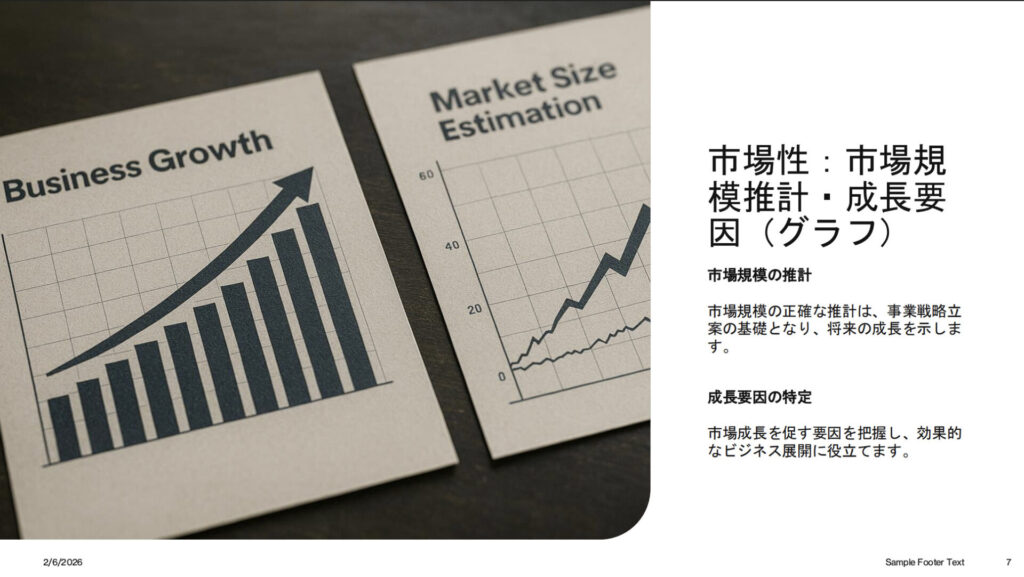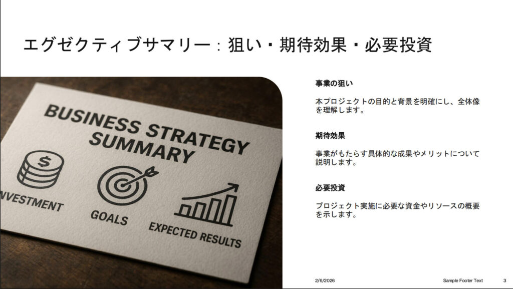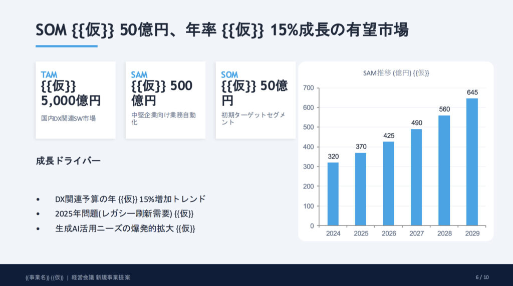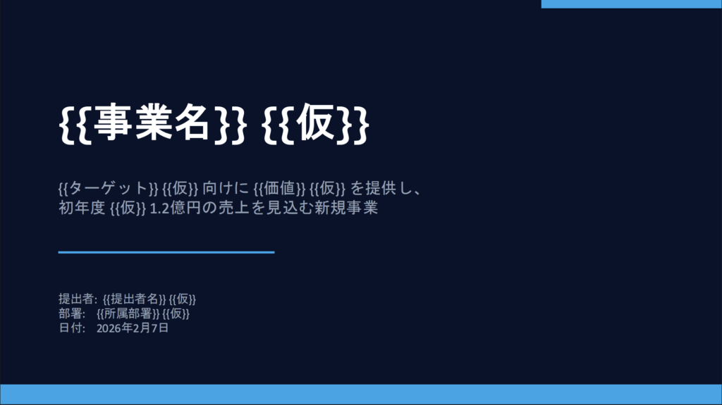 あなたは戦略コンサル兼スライドデザイナーです。新規事業提案のスライドを日本語で作成してください。