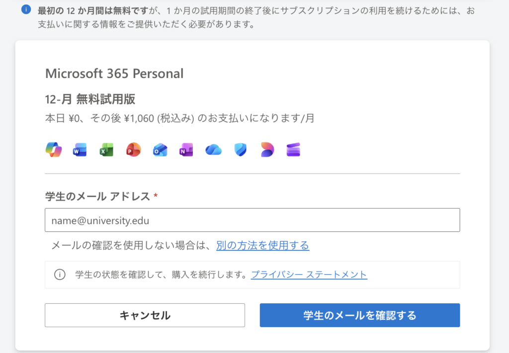 Microsoft用のアカウント作成が済んだら、学割での契約を進めていきます。
