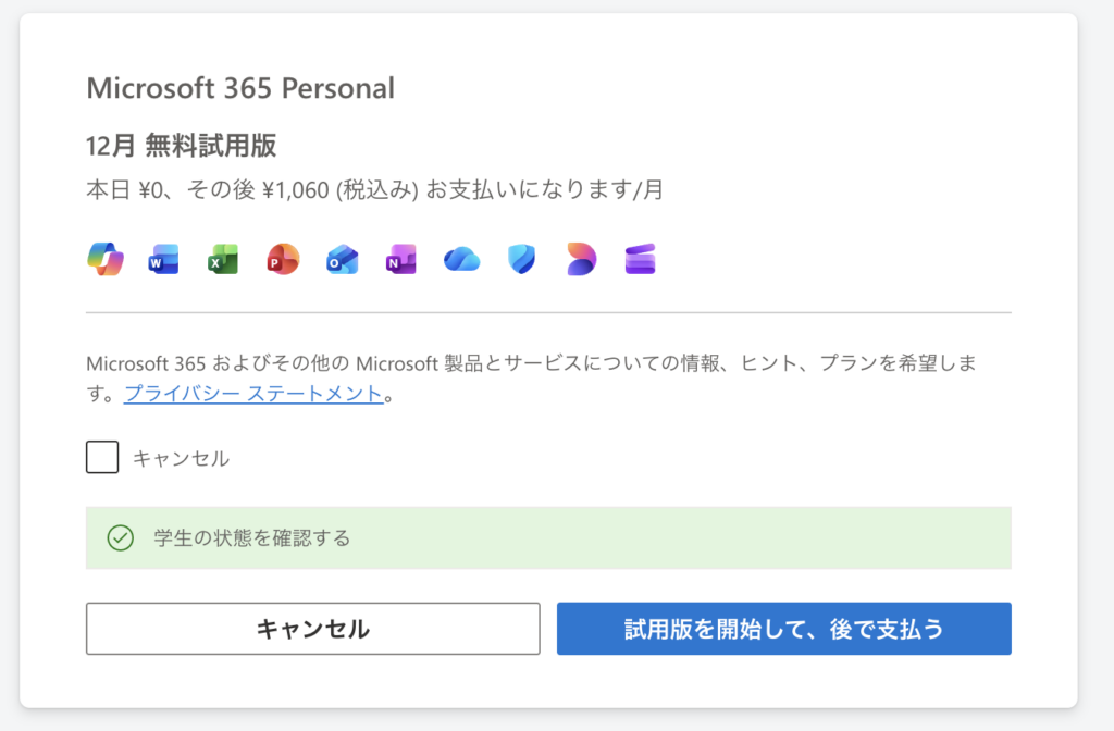 今回の記事で紹介している「Copilotの学割」は正確にはMicrosoftの提供する「Microsoft 365 Personal」というプランの学割利用になります。