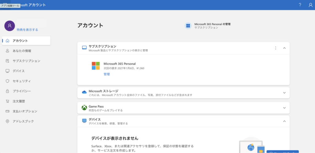 「account.microsoft.com」こちらのリンクからアカウントにサインインします。