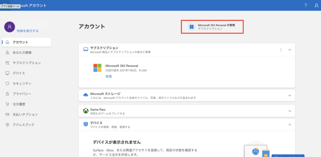 画面右上の「Microsoft 365 Personalの管理」をクリックします。