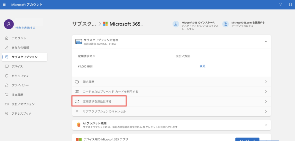 「サブスクリプションの管理」→「定期請求を無効にする」の順でクリックします。