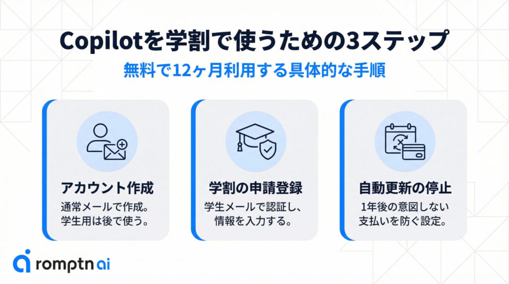 以下では主に3段階で分けて学割でCopilotを使うための具体的な手順を解説します。