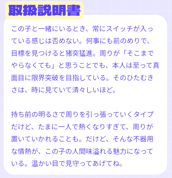 自分のキャラクター以外に、取扱説明書・相性の良いお相手・取扱注意ポイント・キャラコードが表示されるのでそちらも合わせてスクリーンショットを撮っておきましょう。