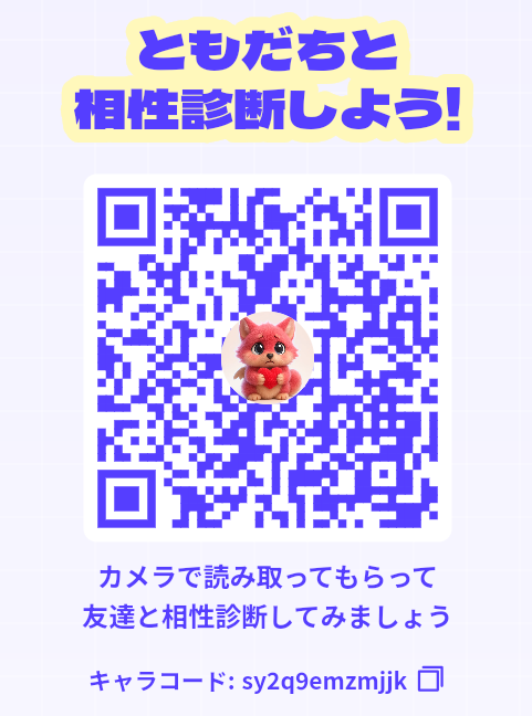自分だけでなく、友達やパートナーと一緒に楽しめるのがKoiキャラメーカーの魅力です。診断結果には「キャラコード」という英数字12桁のIDが付与されるため、相手のキャラコードを入力することで相性診断を行えます。