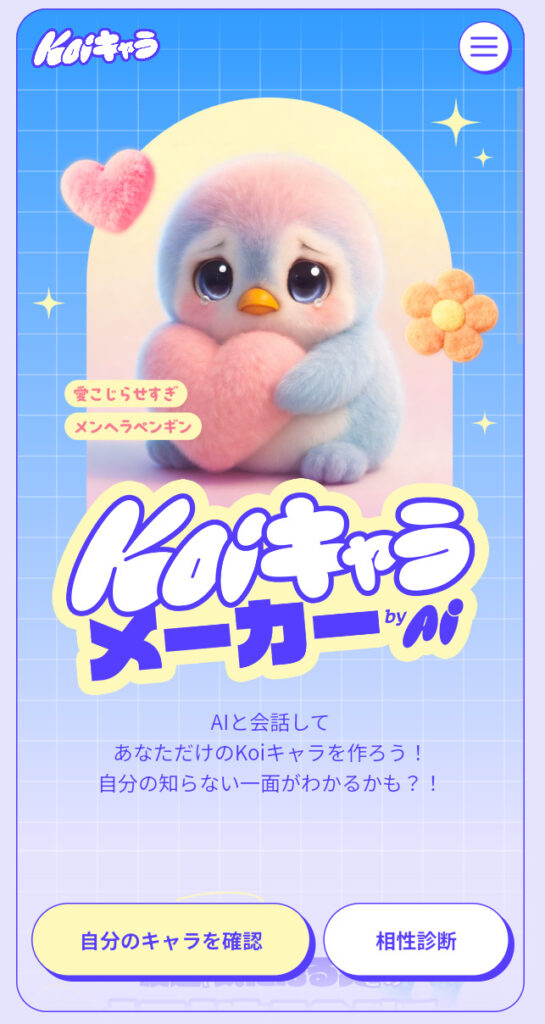- Koiキャラメーカーとは、AIチャットを活用して性格や恋愛観を分析し、その結果を可愛らしいキャラクターとして可視化してくれる無料のWeb診断サービス。