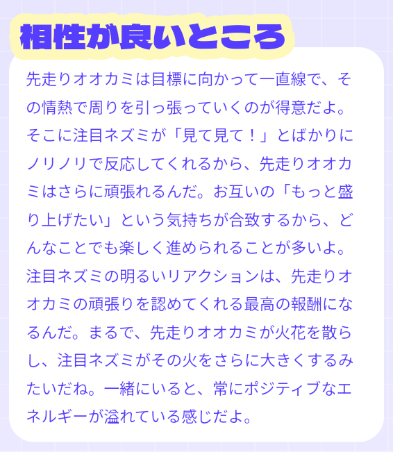 著者が相性診断をしてみた結果、以下のような結果が返ってきました。具体的な例を踏まえて、相性が良いところや相性の壁を教えてくれるので、お互いにどう付き合っていけばうまくいくかのイメージがしやすいと感じました!
