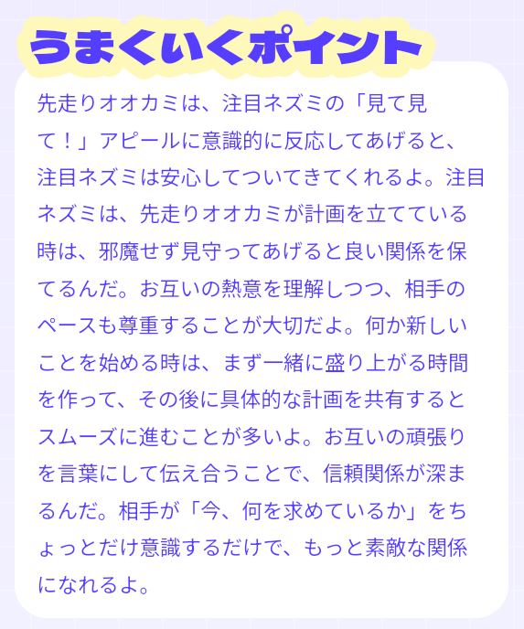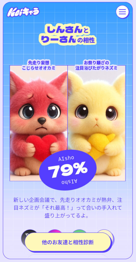 相性◯%という数値だけでなく、相性が良いところ・相性の壁・うまくいくポイントなど、2人の関係性をうまく進めるための具体的なアドバイスも表示されます。 似たもの同士で楽しいのか、正反対だから補い合えるのか、AIならではの分析を楽しんでみてください。
