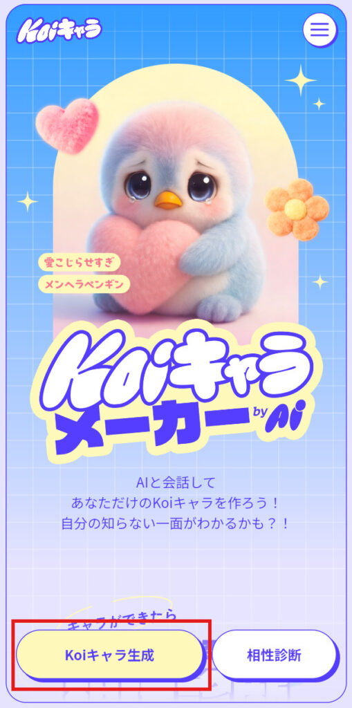 診断はKoiキャラメーカー公式サイトから行います。トップページにアクセスし、画面左下の「Koiキャラ生成」ボタンをクリックすると診断がスタートします。