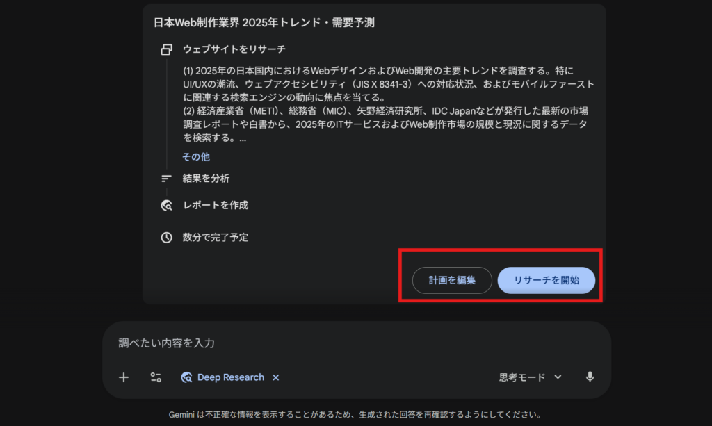 この計画内容で問題なければ「リサーチを開始」を選択し、少し計画を編集したければ「計画を編集」を選択します。
