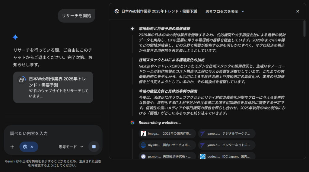 Gemini Deep Researchは、一回の検索で終わることはありません。得られた情報をもとに「さらに掘り下げるべき課題」をAI自身が見つけ出し、何度も追加調査を行います。これにより、表面的なまとめではなく、深い洞察を含んだレポートが完成するのです。