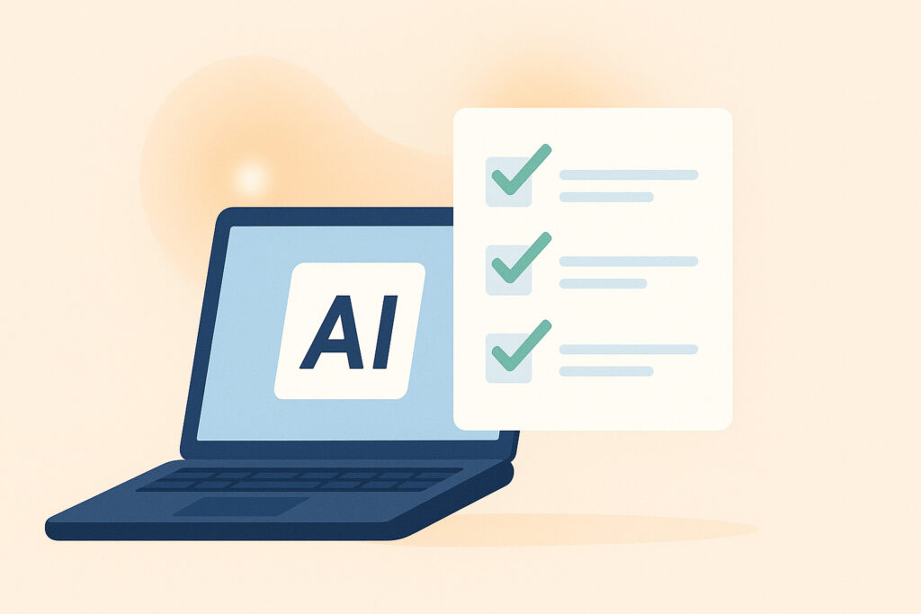要素:ノートPC、チェックリスト、抽象的な光の表現