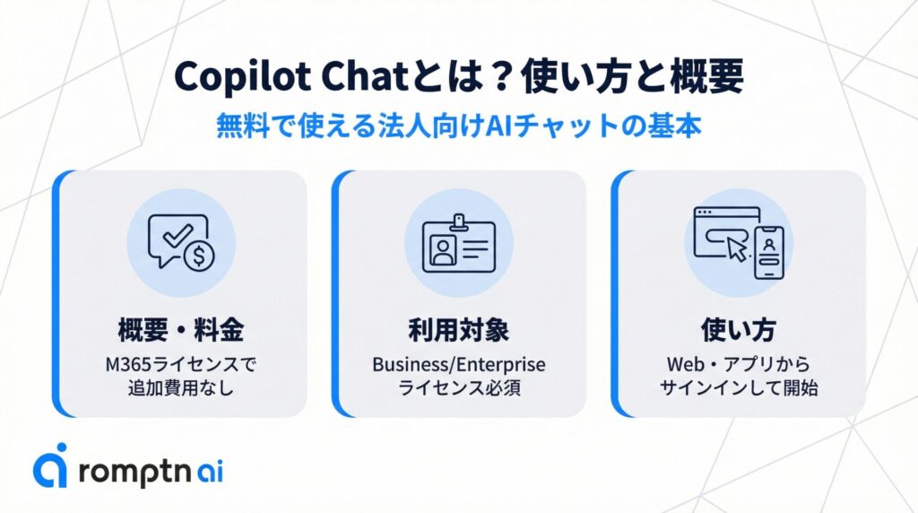 - Copilot Chatは対象のM365ライセンスを持つ業務用アカウントなら追加料金なしで使える仕事向けAIである