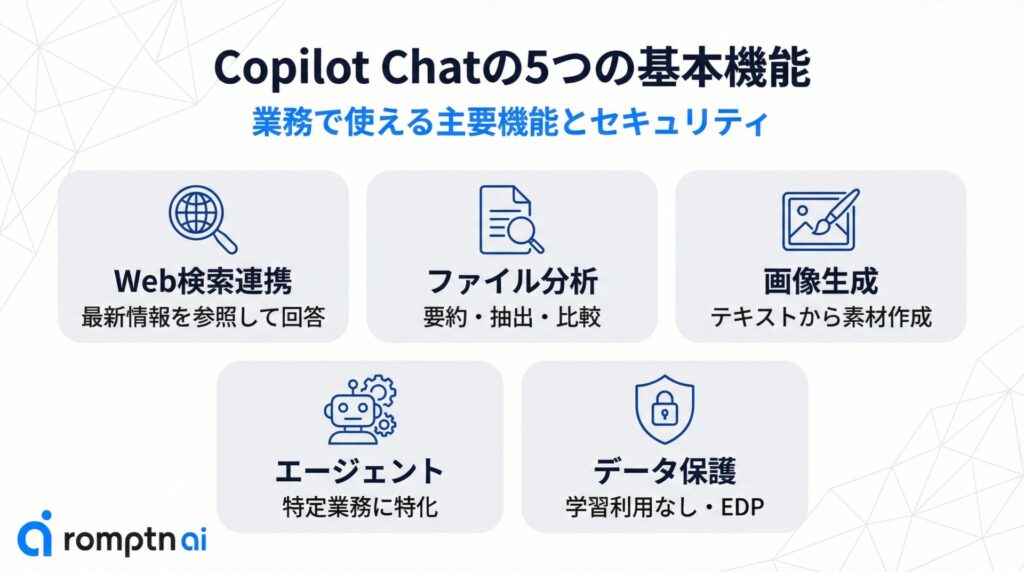 - Copilot ChatはWeb検索と連動した最新情報のリサーチやファイルアップロードによる長文要約などが可能である