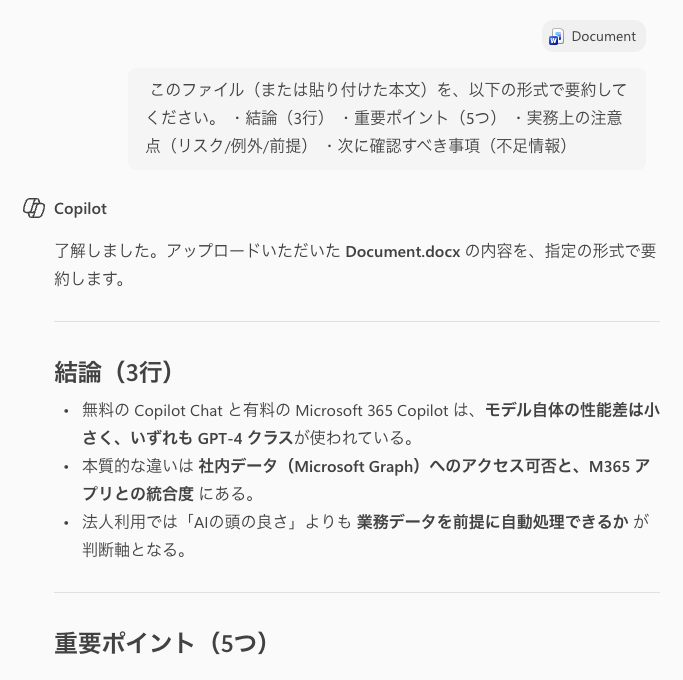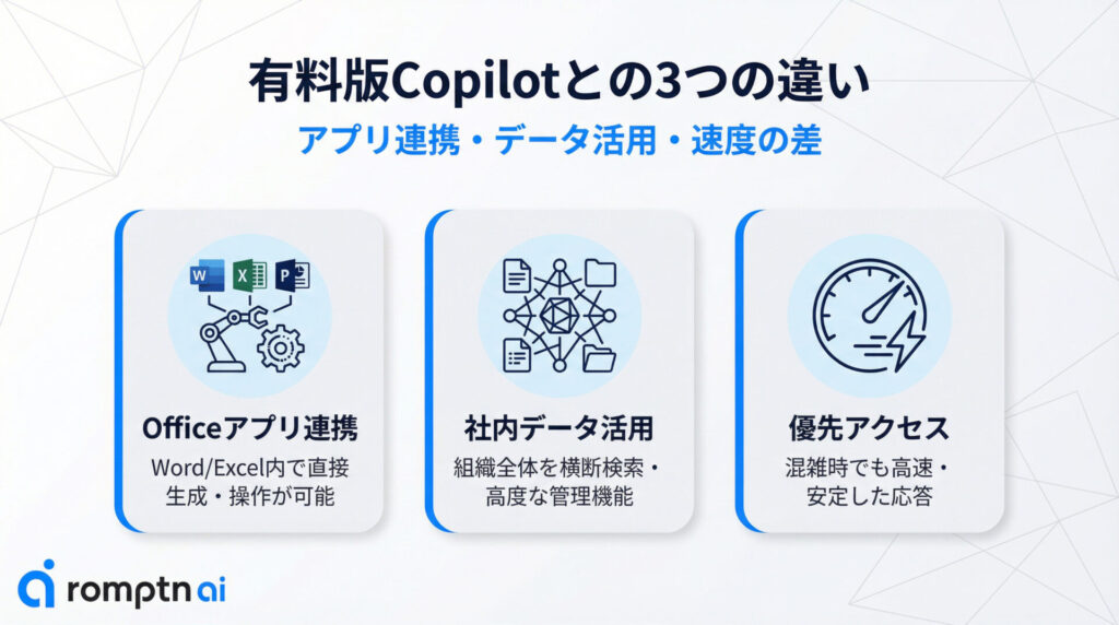 最後に、Copilot Chatと、有料版の「Microsoft 365 Copilot」の違いを整理します。