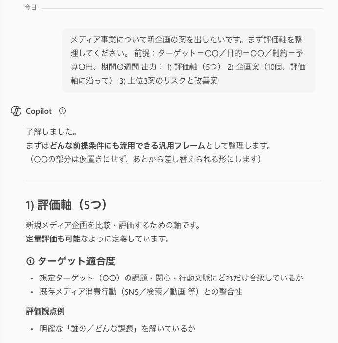 続いてCopilot Chatはブレインストーミング的に企画案の幅出しにも活用することができます。