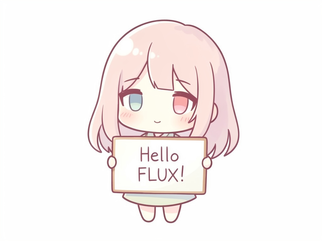 A cute chibi character holding a sign that says 'Hello FLUX!', pastel color palette, simple white background.