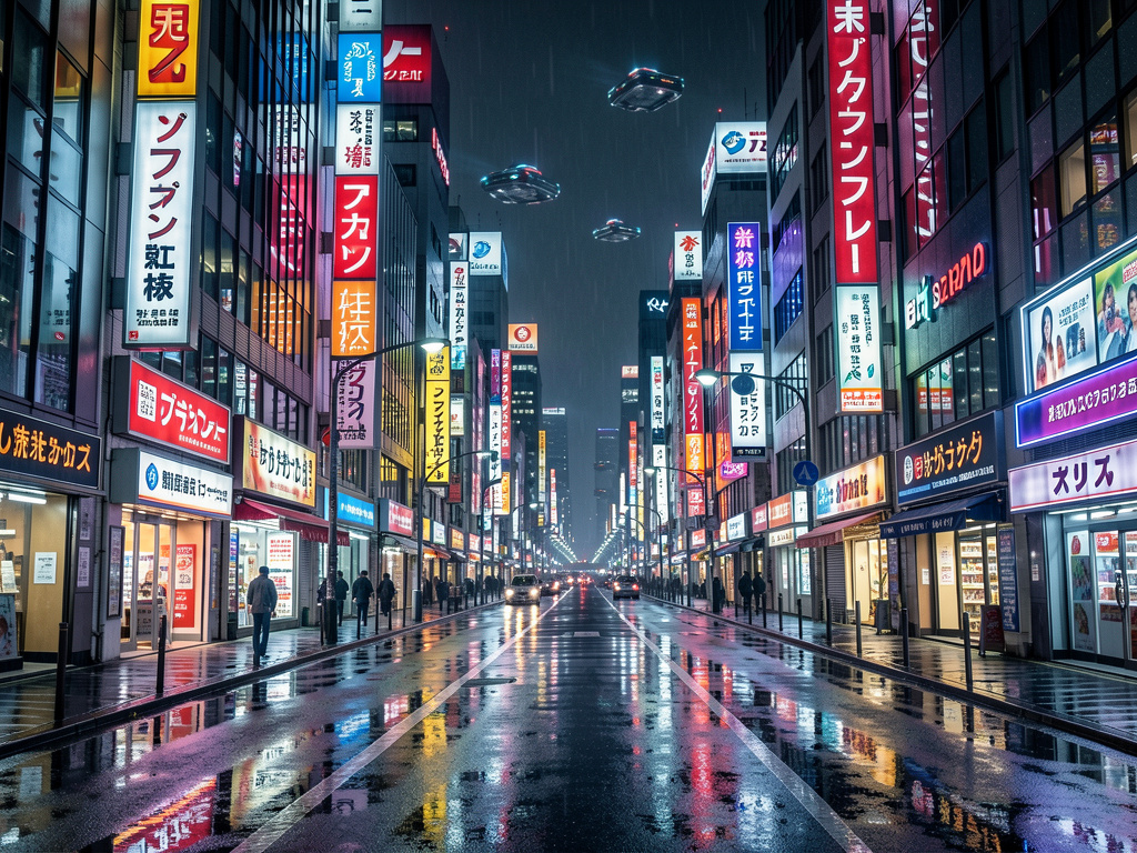 A futuristic Tokyo street at night, neon signs reflecting on wet pavement, flying cars in the distance. Cinematic photography style, high detail.