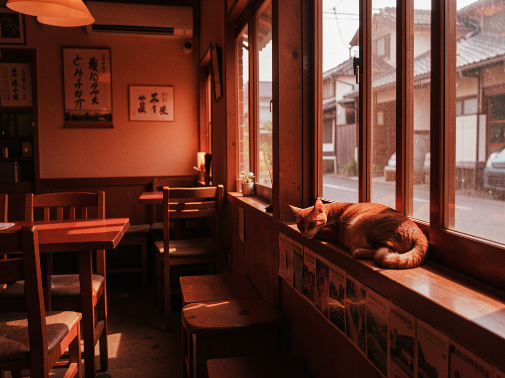 A cozy Japanese café interior with warm lighting, wooden furniture, and a cat sleeping on the windowsill. Soft afternoon sunlight. Anime style illustration.