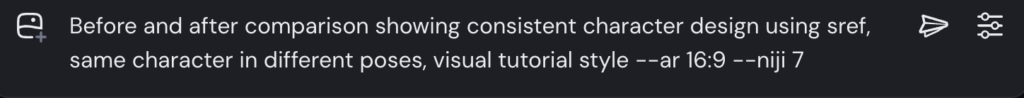 Before and after comparison showing consistent character design using sref, same character in different poses, visual tutorial style --niji 7 --ar 16:9