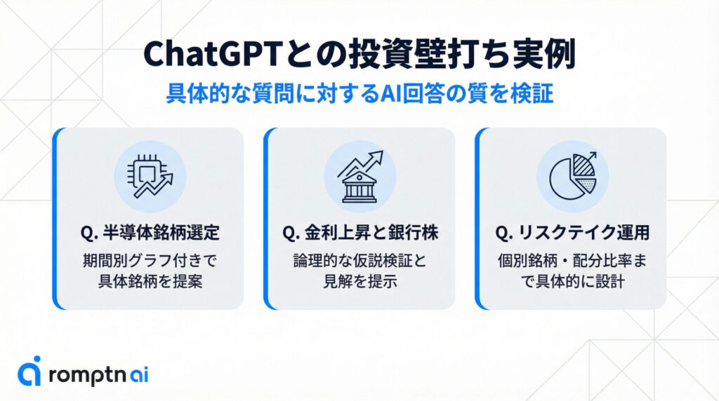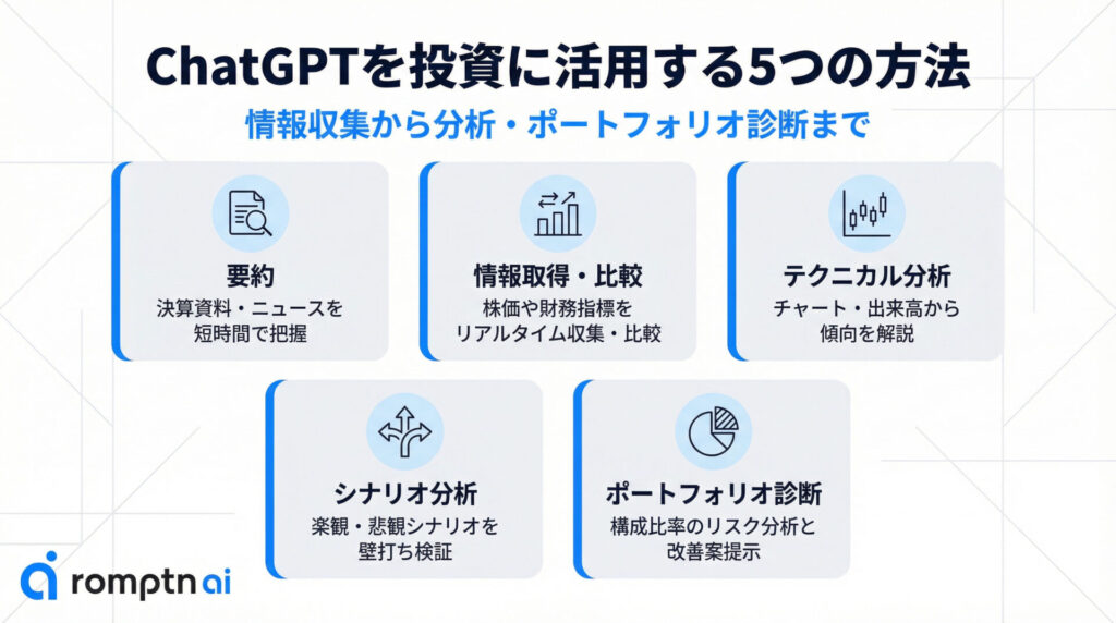 • ChatGPTはチャート分析や将来シナリオの生成、ポートフォリオの診断など、投資判断の壁打ち相手として活用できる