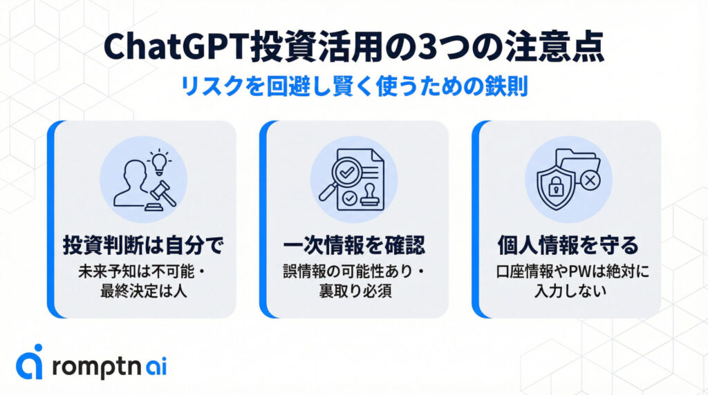ChatGPTは投資において非常に便利である一方、気楽に使ってしまうと後で後悔することになるリスクも孕んでいます。そのため、以下の3つのポイントには特に注意して使用するようにしましょう。