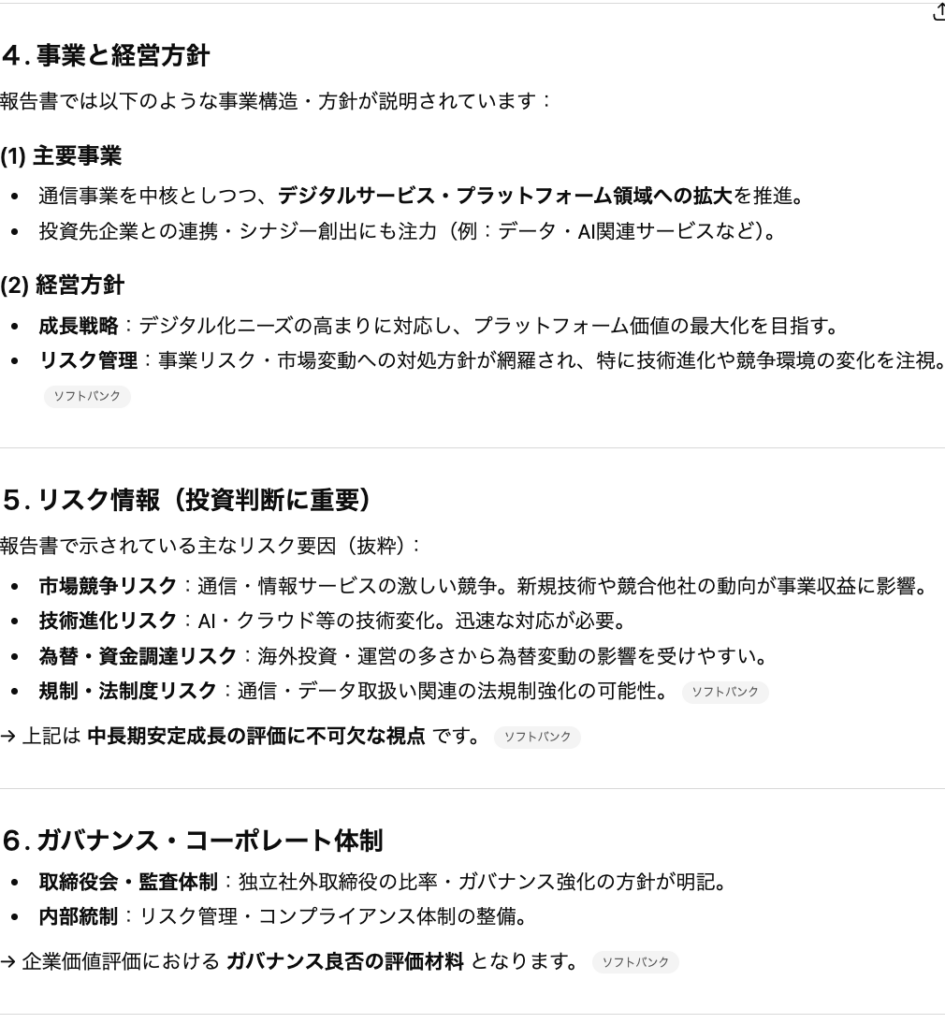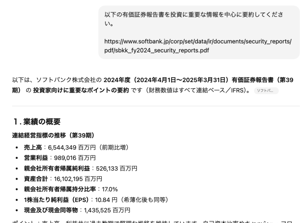 例えばソフトバンク株式会社の有価証券報告書は合計328ページのPDF資料ですが、ChatGPTを活用することでこの資料の要点だけをかいつまんで理解することができます。