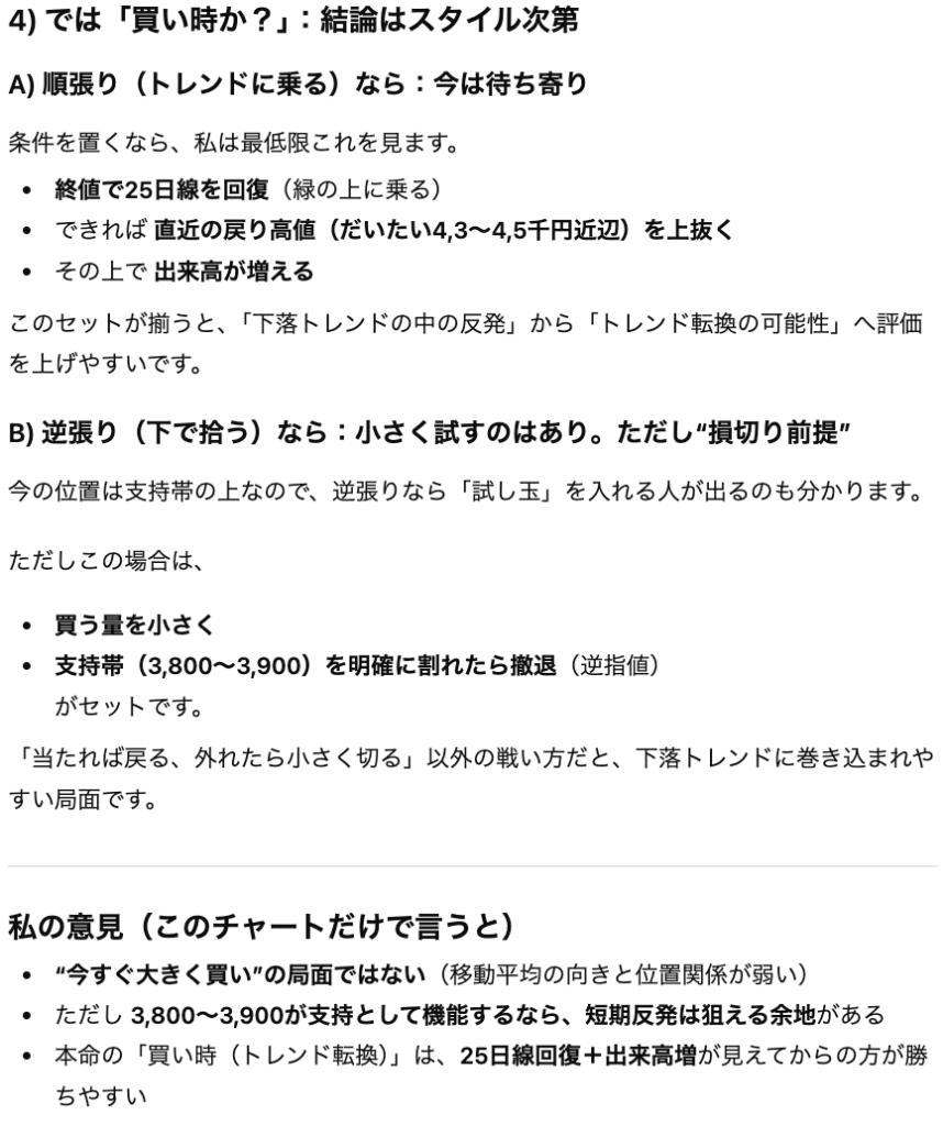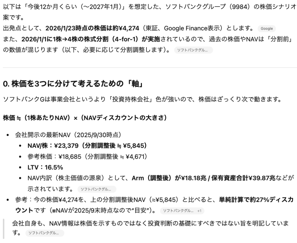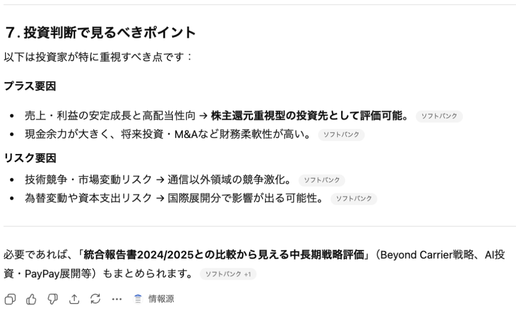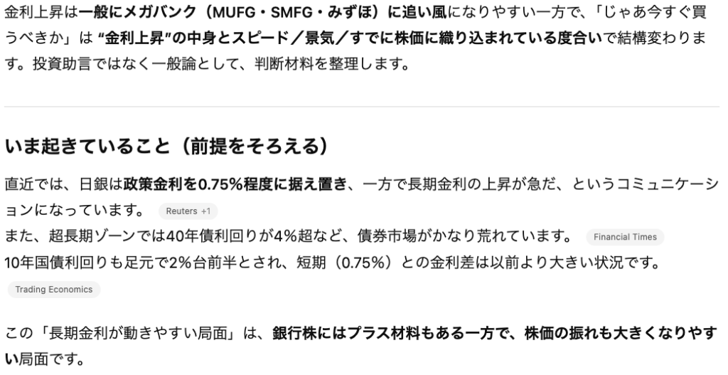 そのため、最終的に売買の意思決定をする際にはChatGPTが提示した論理の「前提」であるデータが正しいかを1次情報にも取って確認する必要があります。