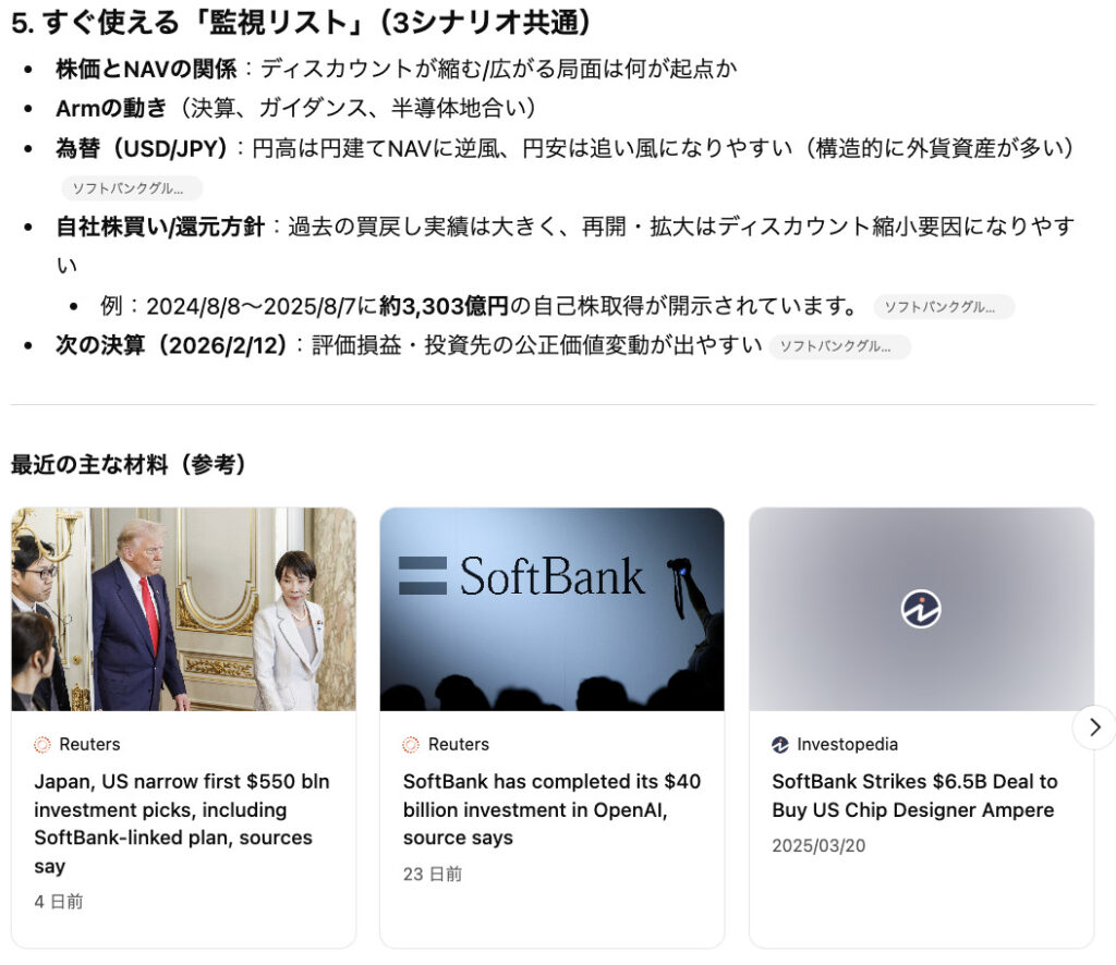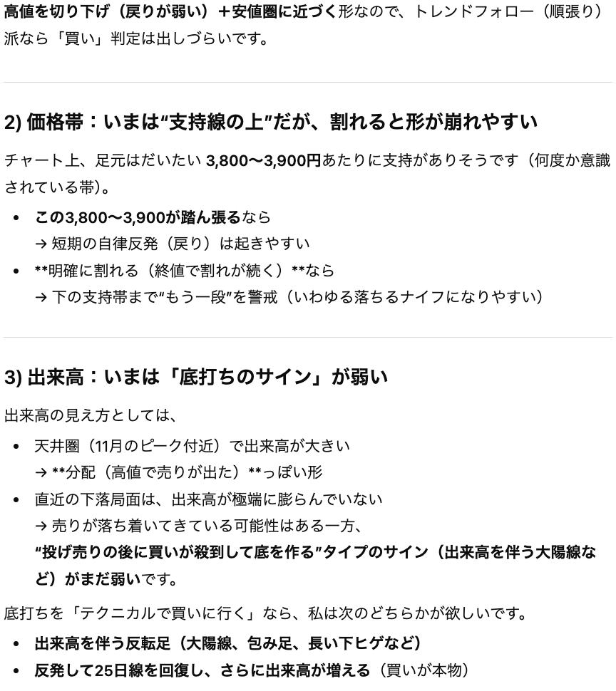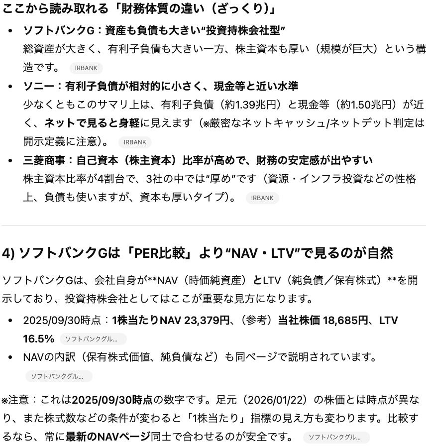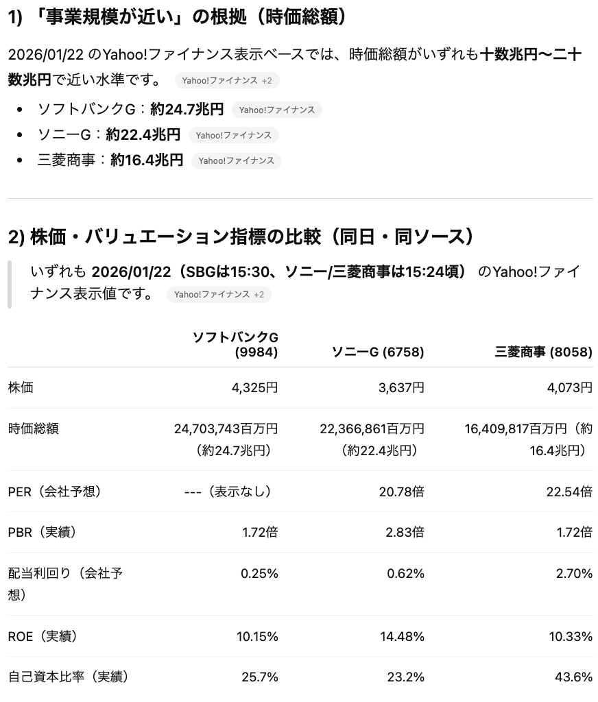 そのため、最終的に売買の意思決定をする際にはChatGPTが提示した論理の「前提」であるデータが正しいかを1次情報にも取って確認する必要があります。