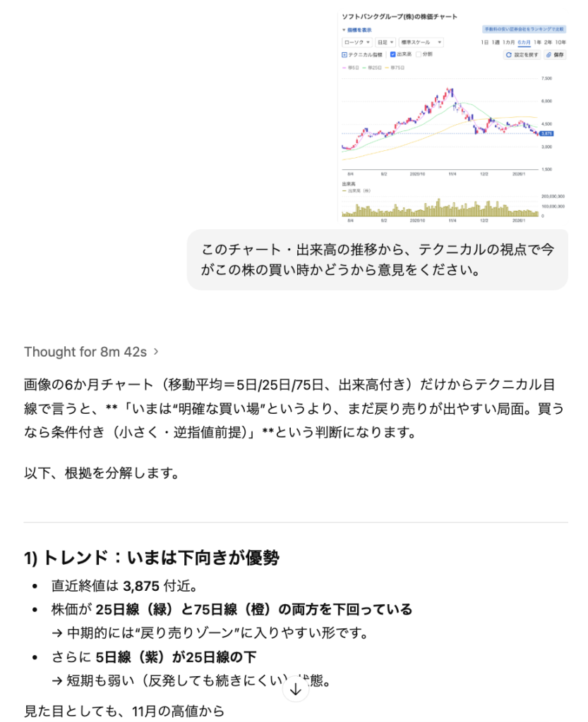 例えば、以下のようにソフトバンクグループの過去の株価推移をチャート・出来高の観点から分析し、「その背景のメカニズム」を説明させることができます。