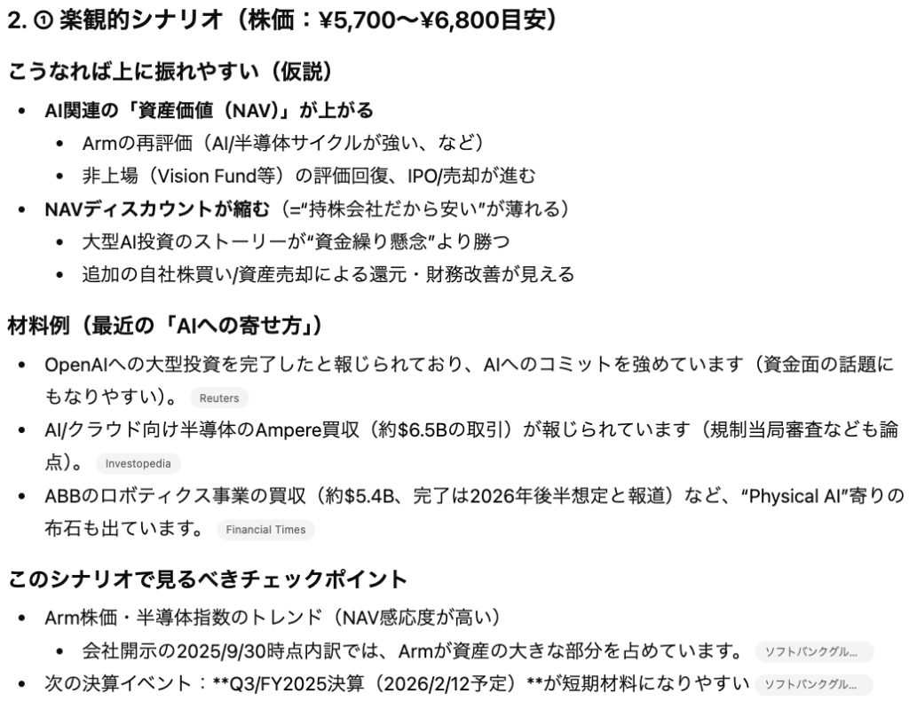 ソフトバンクグループの株価について、①楽観的なシナリオ、②標準的なシナリオ、③保守的なシナリオを考えてください。