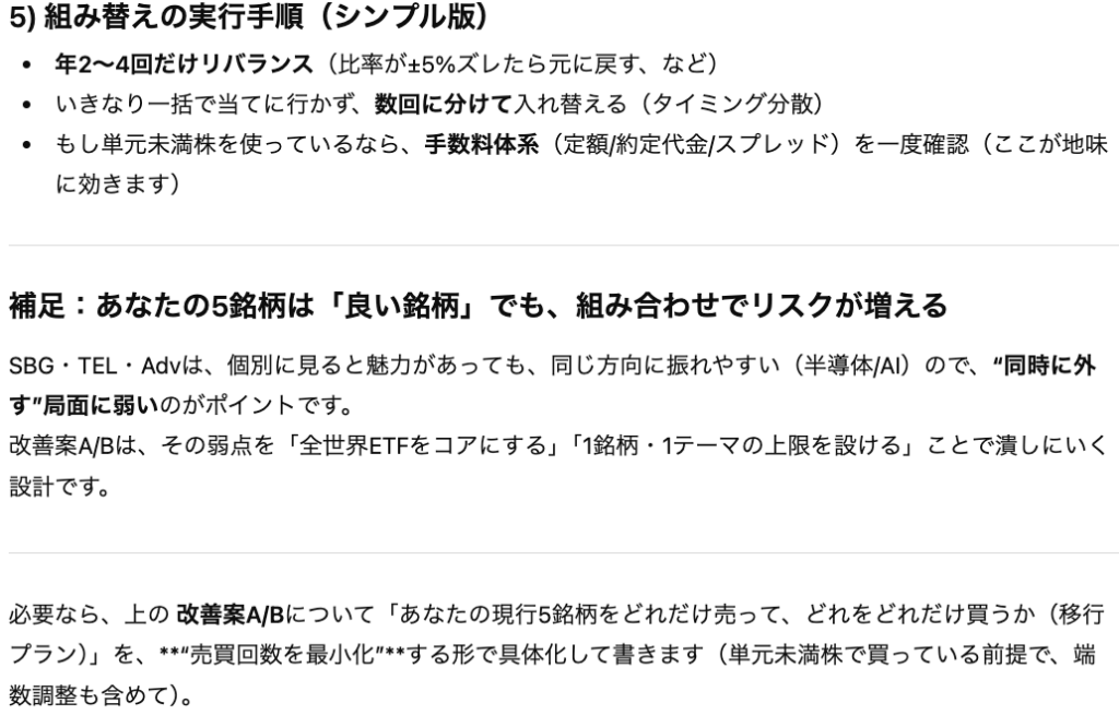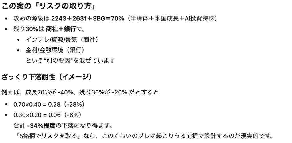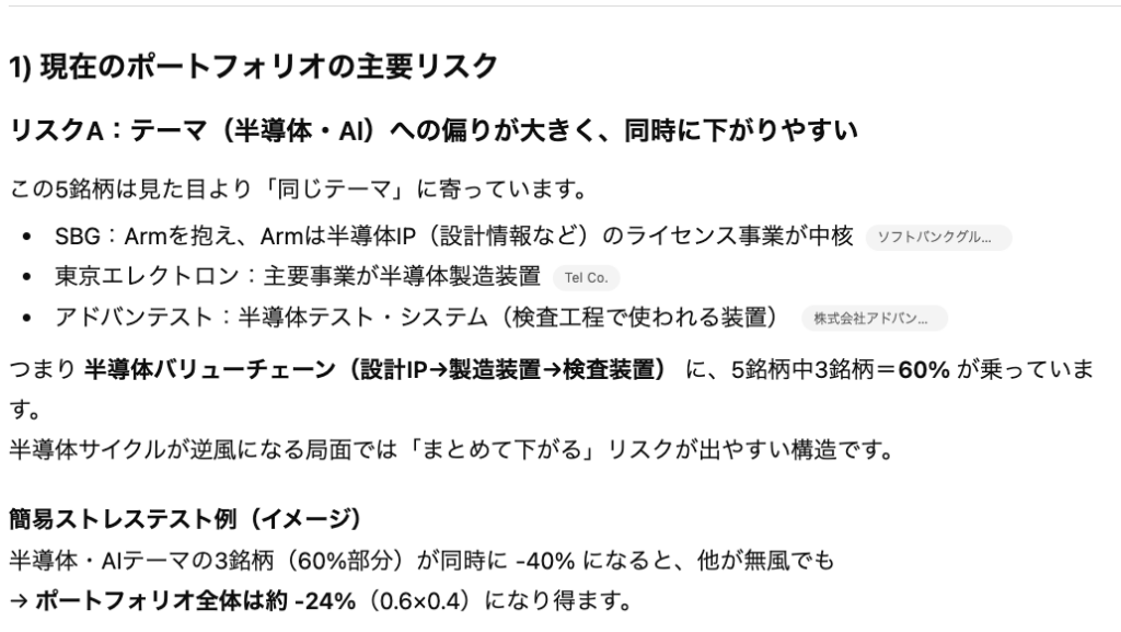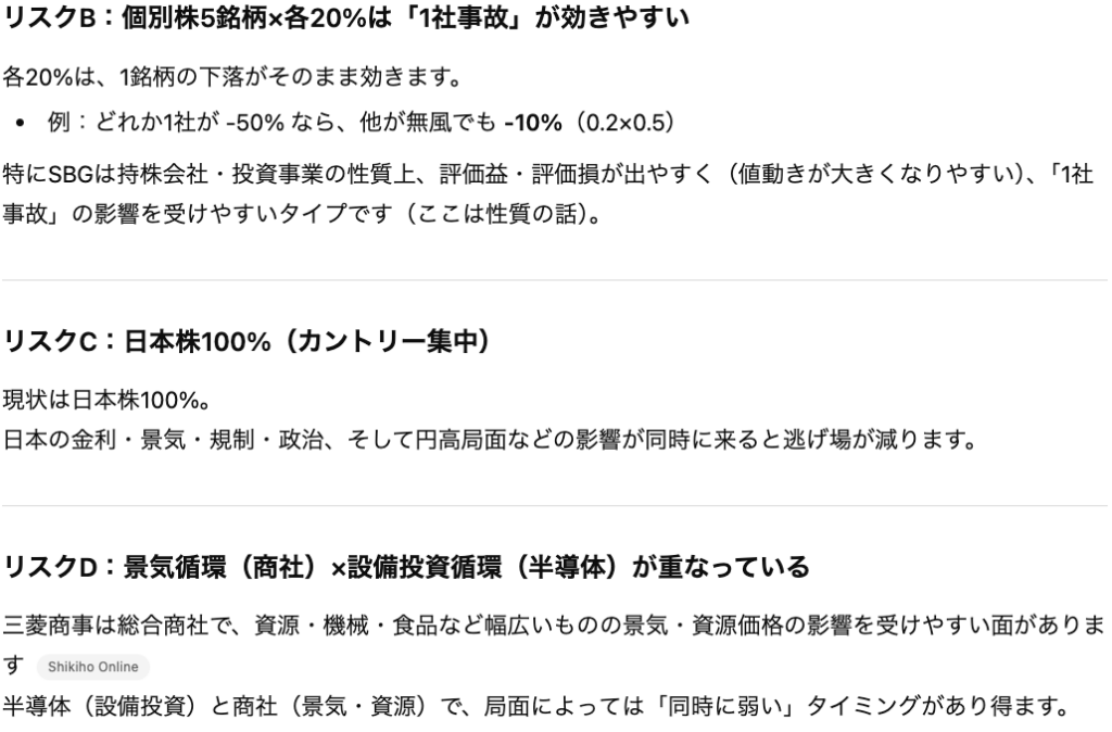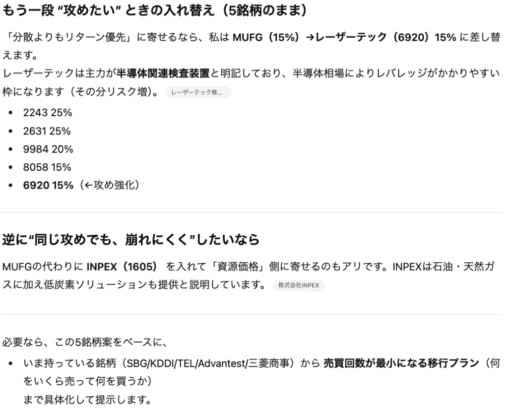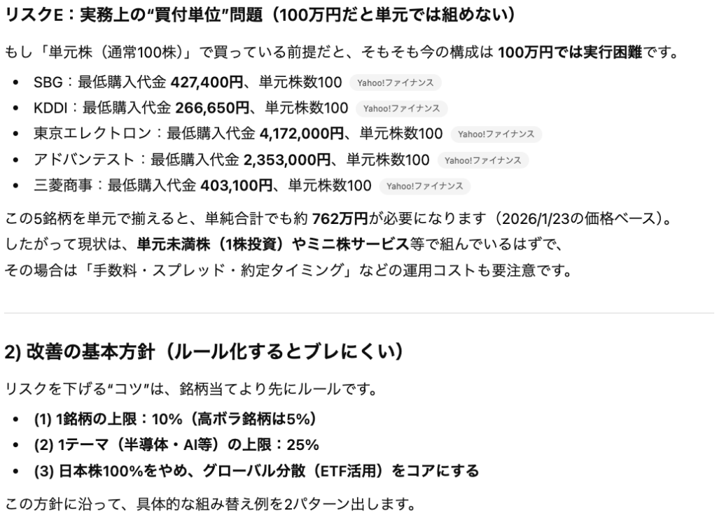 上記の設定で「リスク」と「改善策」を「具体的な銘柄を指定して」という指示の元で考えさせます。