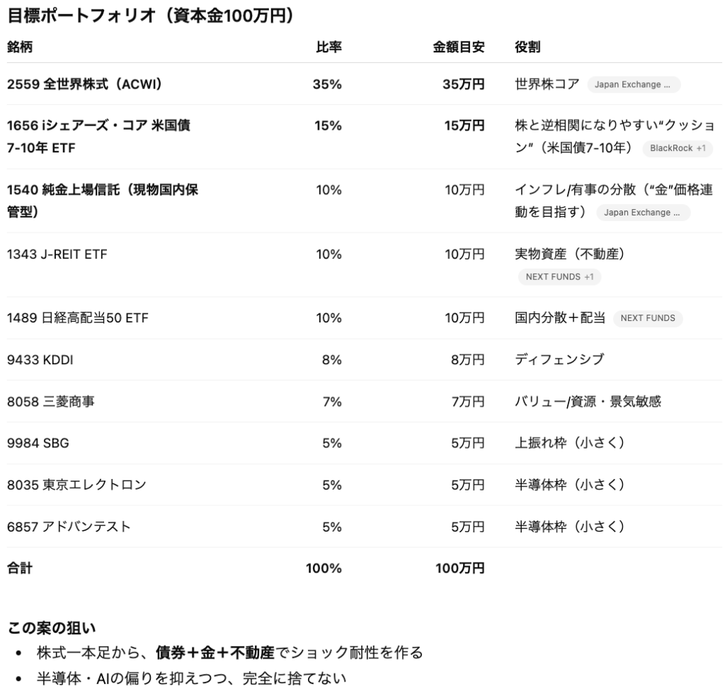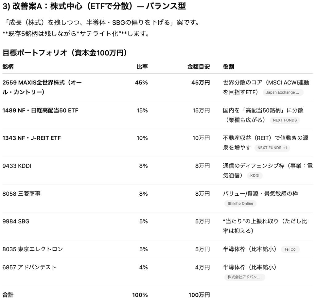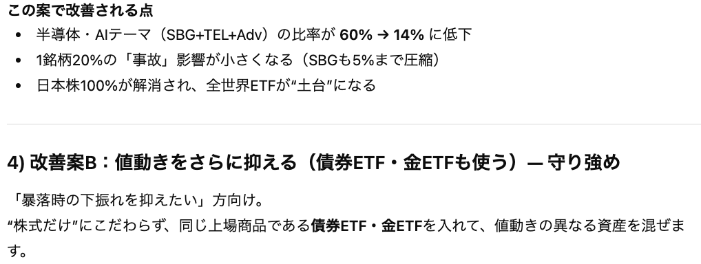 上記のような形でリスクと改善策に加えて、具体的なポートフォリオの構成まで作成してくれました。
