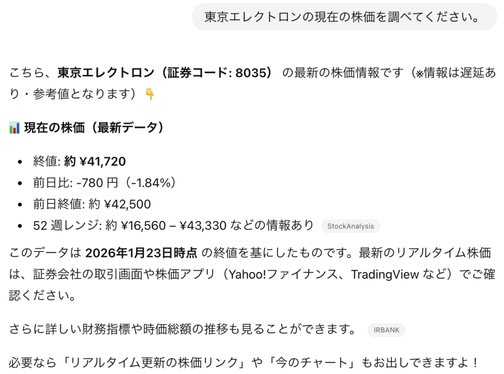 実際に、無料版のChatGPTで1/26日時点の株価を確認させたところ、3日前の株価しか得ることができませんでした。