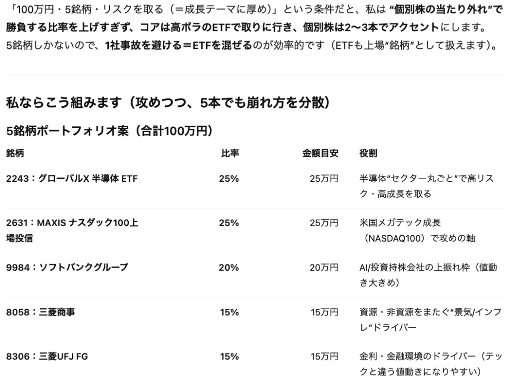 Q. 100万円を5銘柄でリスクを取って運用する場合はどんなポートフォリオが良いと思いますか?