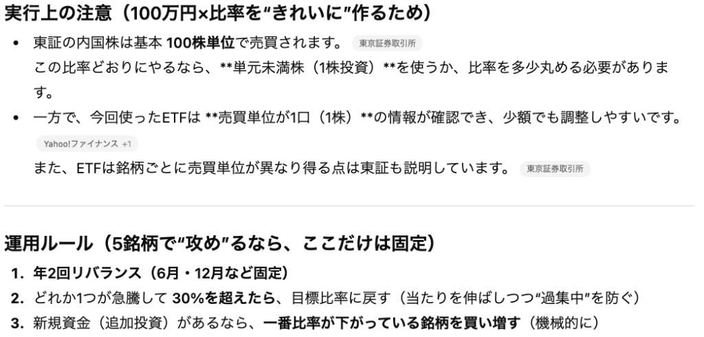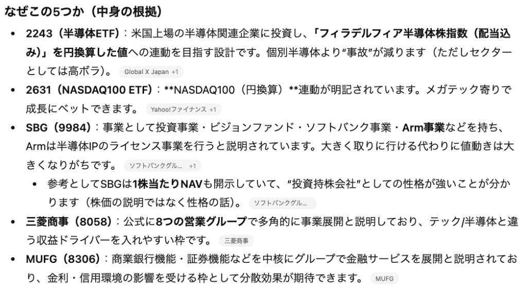 ただ一般論で方針を提示する訳ではなく、具体的な個別株の銘柄や資金配分の比率を提示してくれる点が、よくある生成AIの回答とは異なっており特徴的です。