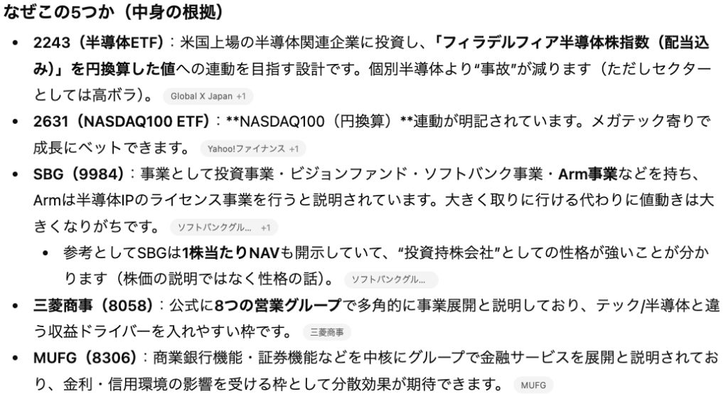 また、以下のように「なぜこの銘柄か」を具体的な理由とともに記載してくれるため、自分自身の学習にも活かすことができます。