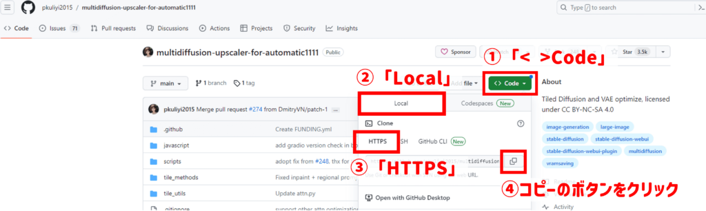 GitHubの「MultiDiffusion」配布ページ→「Code」→「Local」→「HTTPS」に表示されているURLが今回使用するURLです。