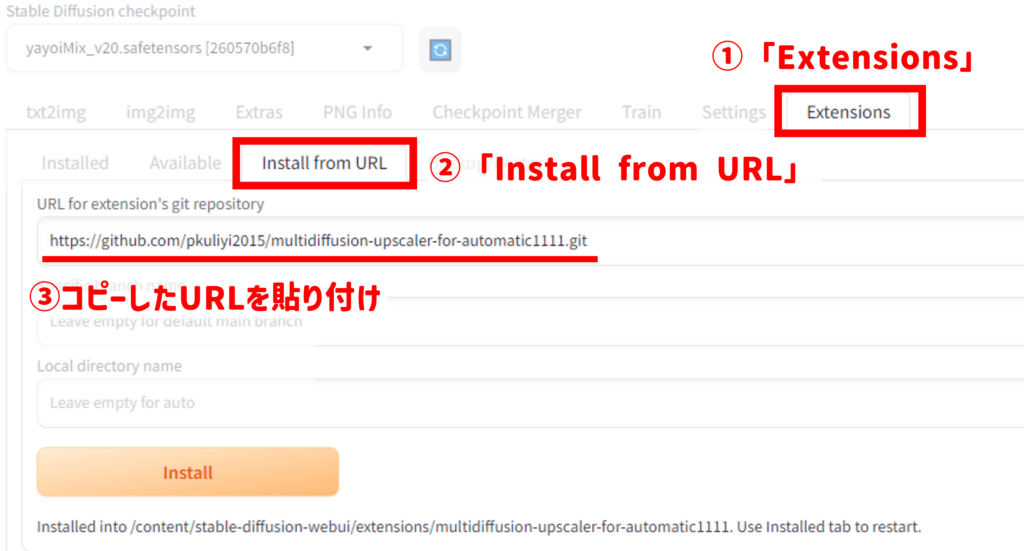 「Extensions」→「Install from URL」の中にある「URL for extension’s git repository」に先ほどコピーしたURLを貼り付けて「Install」を押します。