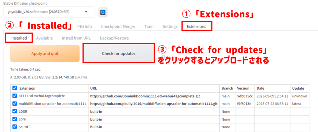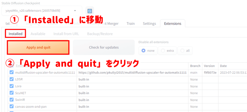 「Installed」に移動して、「Apply and quit」でStable Diffusionを再起動させましょう。