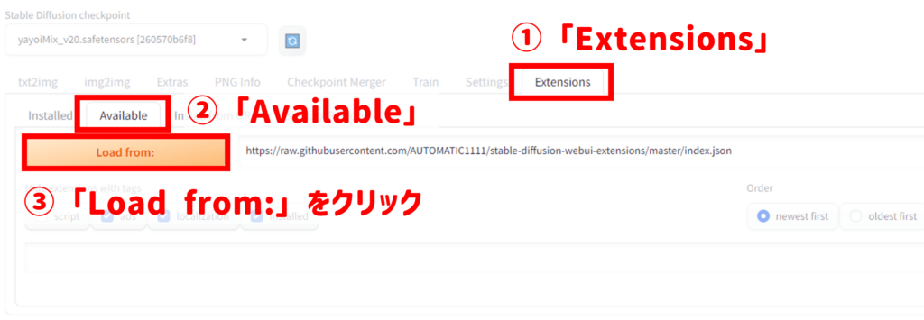 Stable Diffusionの「Extensions」→「Available」にある「Load from:」を押します。