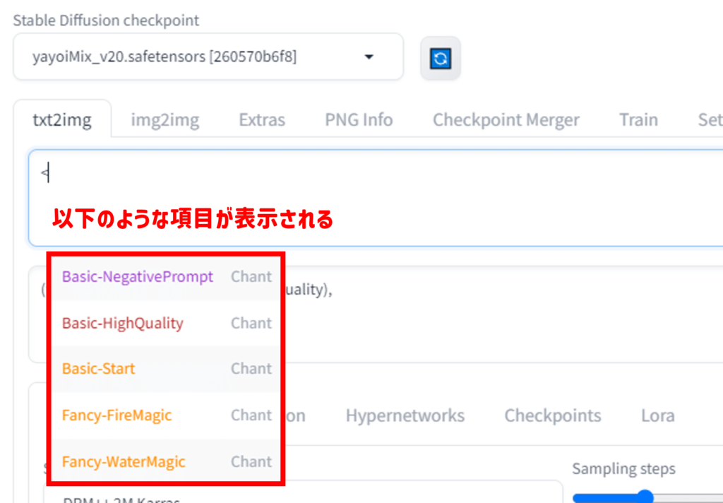 また、「SD WebUI Tag Autocomplete」には、「chant」という複数のプロンプトを一括入力してくれる設定があります。