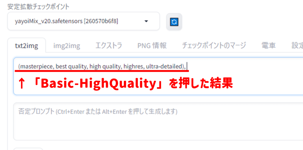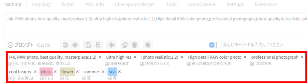 「Prompt All in One」を追加した状態でプロンプトを入力すると、