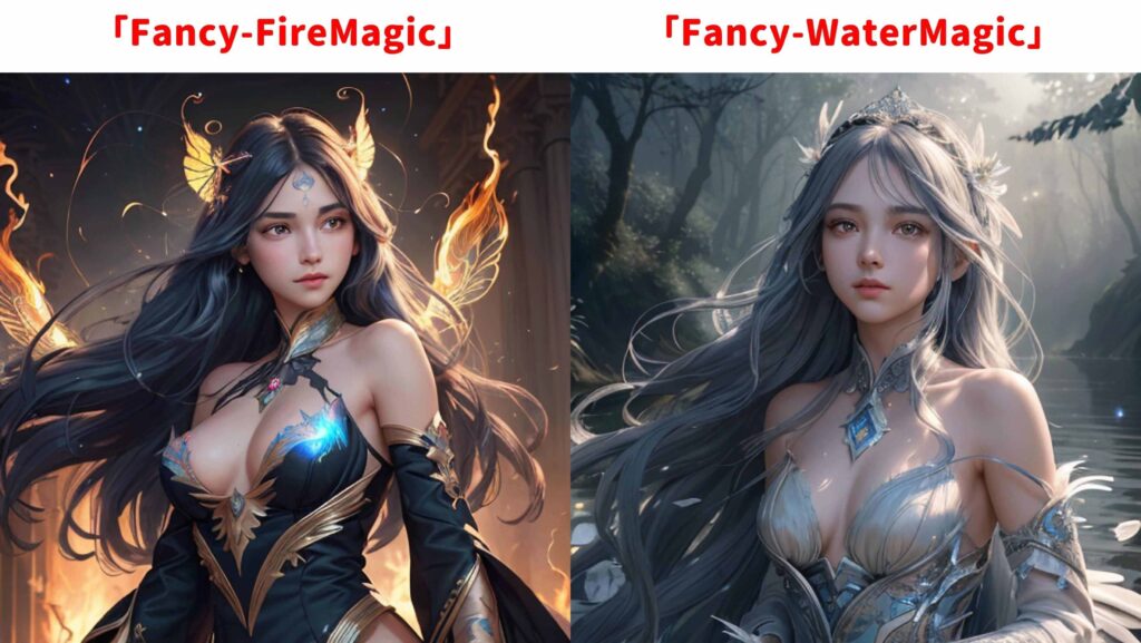 ちなみに、「Fancy-FireMagic」と「Fancy-WaterMagic」をクリックすると、以下のようなプロンプトが自動設定されます。
