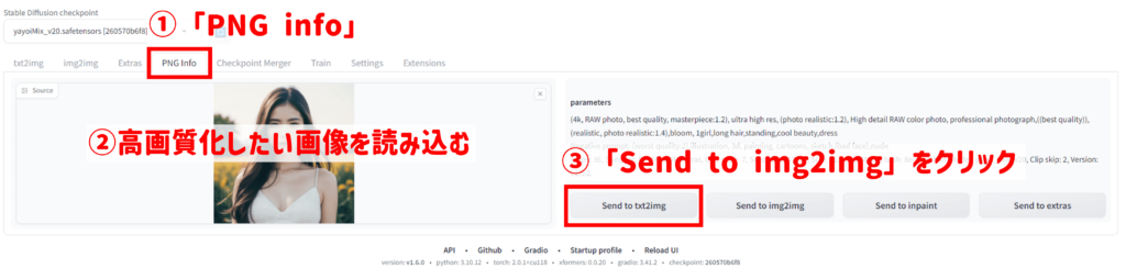 「PNG info」に高画質化したい画像をドロップまたはクリックして読み込み、「Send to img2img」ボタンを押して「img2img」に画像の情報を送ります。